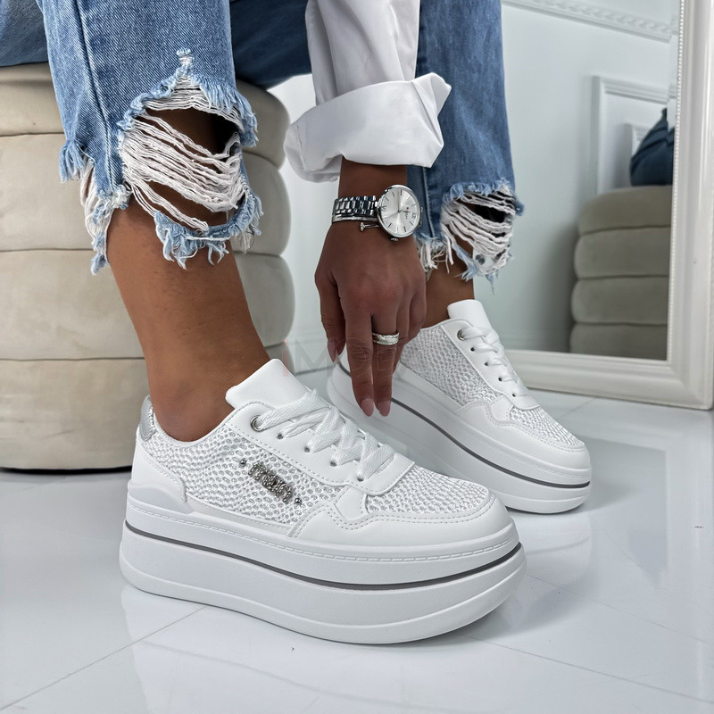 Typ obuvi : TeniskyOdporúčanie pre veľkosť : Zodpovedá klasickému číslovaniu (rozmery v tabuľke)Farba : Biela, StriebornáUrčené pre : ŽenyDoplnené o : Cvoky/PrackyVýška podrážky : 5 cmKrajina pôvodu : P.R.C.Materiál zvršku : Syntetika, TextilMateriál podšívky : TextilMateriál podrážky : Syntetika- Instagram Photos