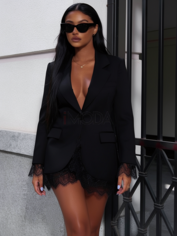 Exkluzívny model saka doplnený o všitú čipku. Týmto detailom sa okamžite stáva luxusným kúskom v šatníku každej FASHIONMANIAČKY.  Sako sa zapína na gombíky. Dĺžka saka umožňuje tento model nosiť aj ako šaty. Baby v iMODA si tento model okamžite zamilovali.