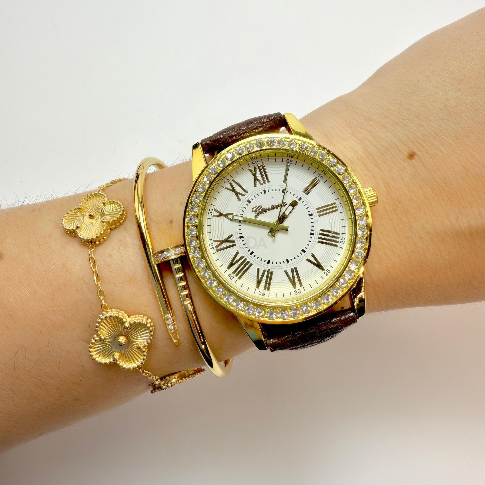 Značka : GenevaMateriál : Chirurgická oceľ, Bižutéria, Eko-kožaUrčené pre : ŽenyFarba remienka/náramku : HnedáDĺžka remienka : 22 cmMožnosť regulácie dĺžky : Áno (náramok je možné nastaviť)Farba ciferníka : BielaŠírka ciferníka : 41 mmStrojček hodiniek : Bateriový quartzFunkcie hodiniek : ČasDarčeková krabička : Bez krabičkyPoznámka : Hodinky sú dodávané bez doplnkov- Instagram Photos