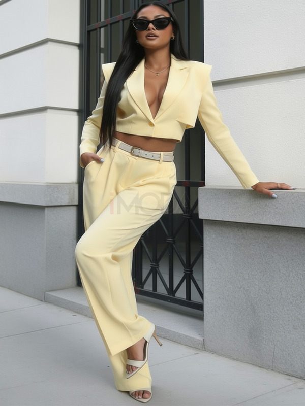 Štýlový nohavicový komplet STAR. Nohavice sú voľného, padavého strihu. Sako je trendom sezóny a jeho CROP strih z neho robí kúsok, ktorý môžes smelo kombinovať ku všetkému.
